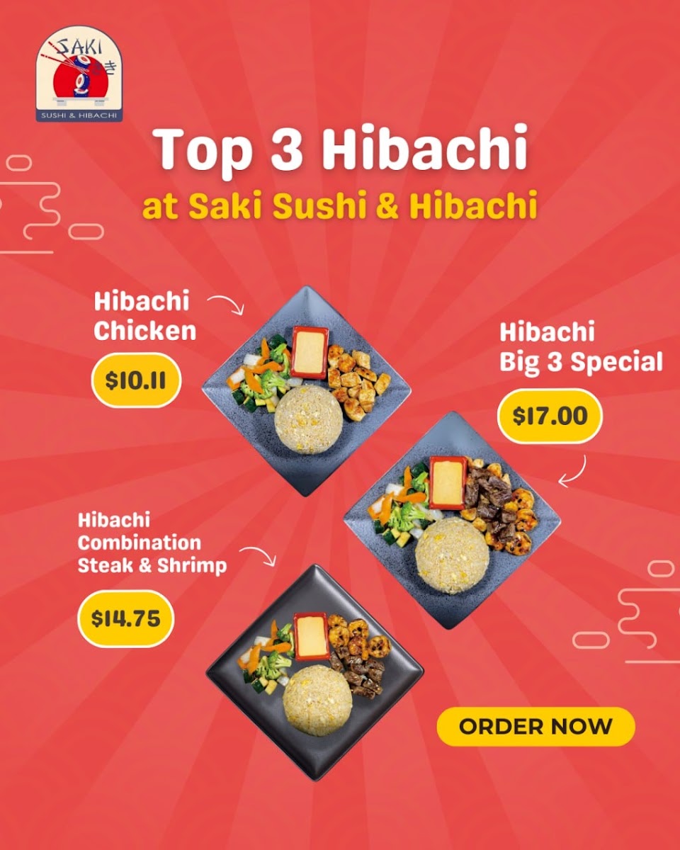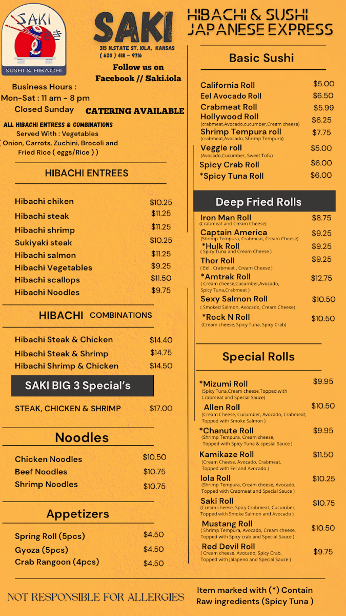 The menu at Saki Sushi & Hibachi reflects a straightforward, approachable style, blending fast food convenience with flavors rooted in Japanese cuisine. It features a mix of casual bites like classic sushi rolls and hearty hibachi dishes, perfect for a quick lunch or a relaxed dinner on the go.